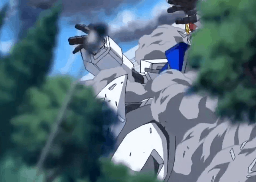 The Strike, piloted by Marue Ramius, falling down as it is struck by a GINN.