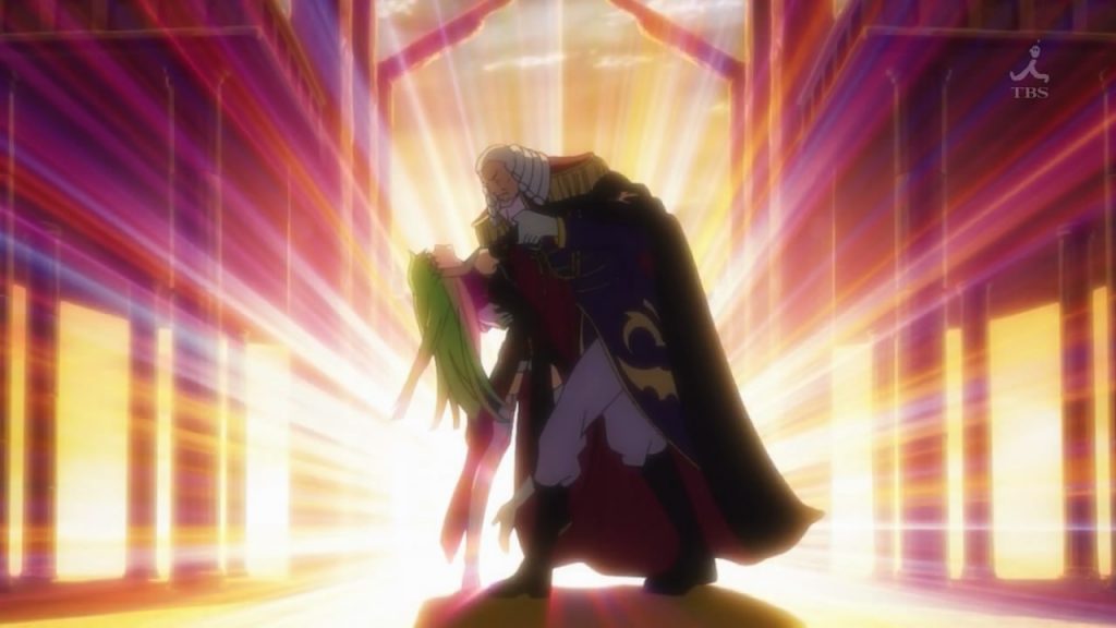 On the other hand, C.C. continues to lead the Order of Black Knights in place of Lelouch. She saves Lelouch again from the armed imperial forces. C.C. kisses him to release his sealed memories, which again shows that she cares for him. In episode 15 of Code Geass Rebellion R2, She decides to give her code to Charles Vi Britannia because Lelouch didn’t take action when she asked him to take her code for himself.