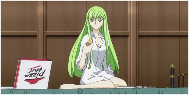 She seems much calmer with Lelouch than in her previous lonely life. She really enjoys moments like eating pizza at Lelouch’s house. C.C. even got the chance to experience the life of a high school student. It is true she just did so to assist Lelouch in his future missions, but still, she looks more vibrant in school uniform.