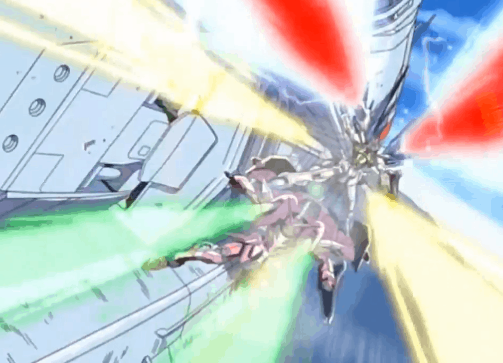 Beams appear to be more penetrative compared to railguns though as seen when Kira, using the Freedom, uses the railguns on the Destiny. The result is a mere blast that does not do any significant damage to the Freedom however the pilot of the Destiny, Shinn Asuka, makes a comment, “If those were beams, then this would be over already. Is that what you’re trying to tell me?! Is that what this is a lesson?!”