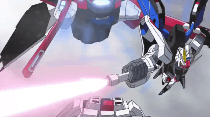 Because of its sheer power compared to other mobile suits, the Strike, equipped with the Launcher Striker Pack, was able to fend off the Le Creuset team with the strategic move of using a smoke screen and a long range bombardment from the 320 Hyper Impulse cannon.